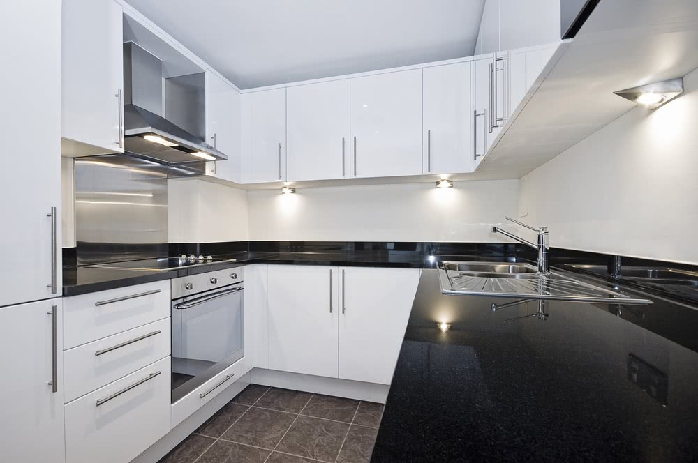 Белая кухня со столешницей черного цвета подойдет для маленьких кухонь, позволяя выглядеть помещению просторнее