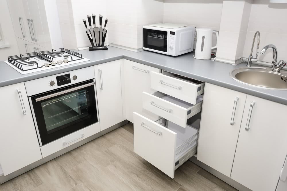 Каждый месяц очищайте гарнитур жидкостью для посуды и теплой водой. В конце обязательно все поверхности нужно протереть насухо. Плитку и швы между ней легко очищают пастой из соды и уксуса.