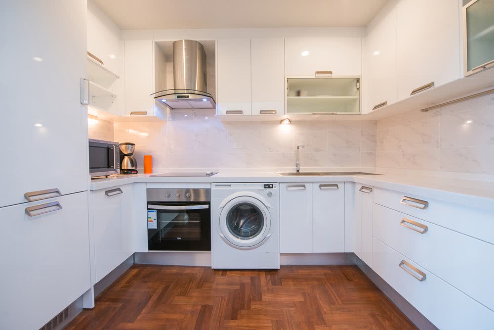 Белая кухня + черная техника смотрится неординарно и элегантно, к тому же черные приборы довольно популярны. Присущи такие сочетания для стилей с нотками контраста и грубоватости, таких как скандинавский, лофт или арт-деко. В данном случае можно сделать также столешницу темной, чтобы уравновесить общую композицию.