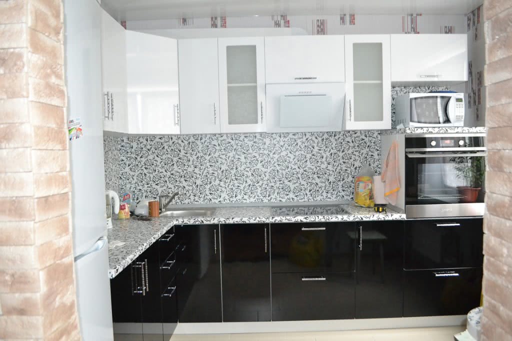 С кухонным гарнитуром и столешницей можно проводить эксперименты, а черные обои с резным белоснежным узором довольно стильно и современно будут смотреться со шкафом красного цвета; в таком случае столешница должна быть черной. Для гарнитура на кухне и вовсе можно сделать четкое разделение белого и черного цвета. На стены стоит повесить белоснежную вытяжку и шкаф, а на пол – только черные. Темной будет и столешница с плитой. На стенах можно делать акценты, идеально подойдут структурированные обои, которые сделаны с имитацией с кирпича или плитки. Нежный цвет зеленого газона добавит интерьеру свежести.