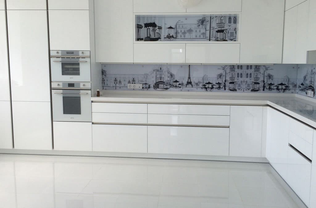 Выбор изображений достаточно широк – это может быть как фото мегаполиса, так и цветы, овощи или фрукты, абстрактные композиции, а также укладка в шахматном порядке. Узоры могут перекликаться с рисунками на обоях, шторах или текстиле.