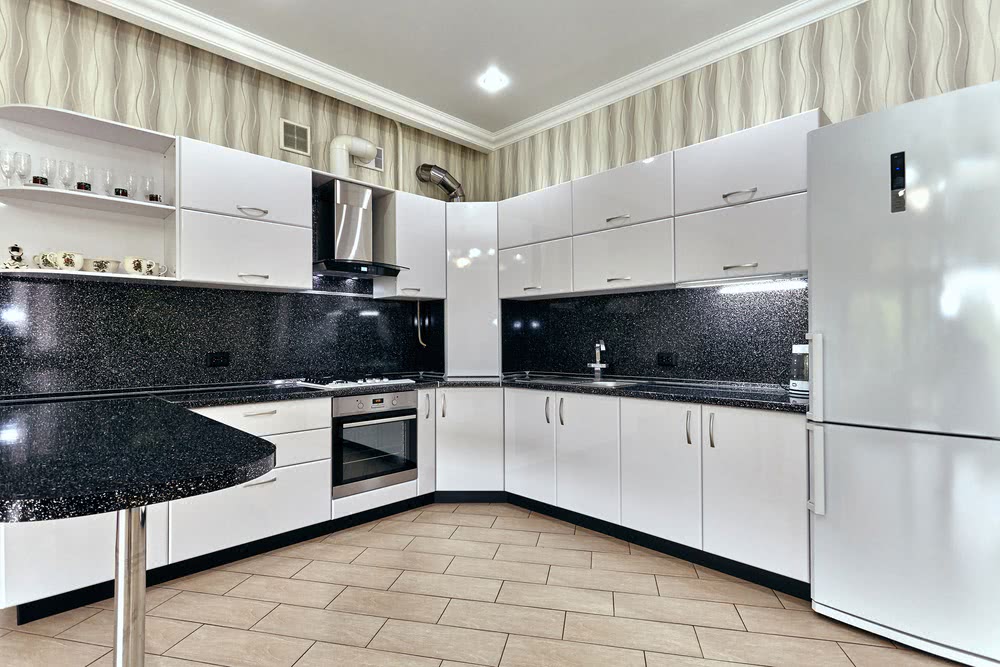 Черная столешница может использоваться, если кухня просторная. Лучше всего, если вся мебель и стены будут полностью белыми. Такой вариант оформления, в совокупности с черной столешницей, смотрится очень элегантно и стильно.