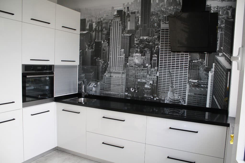 Фотообои “Мегаполис” при оформлении кухни в черно-белом варианте.