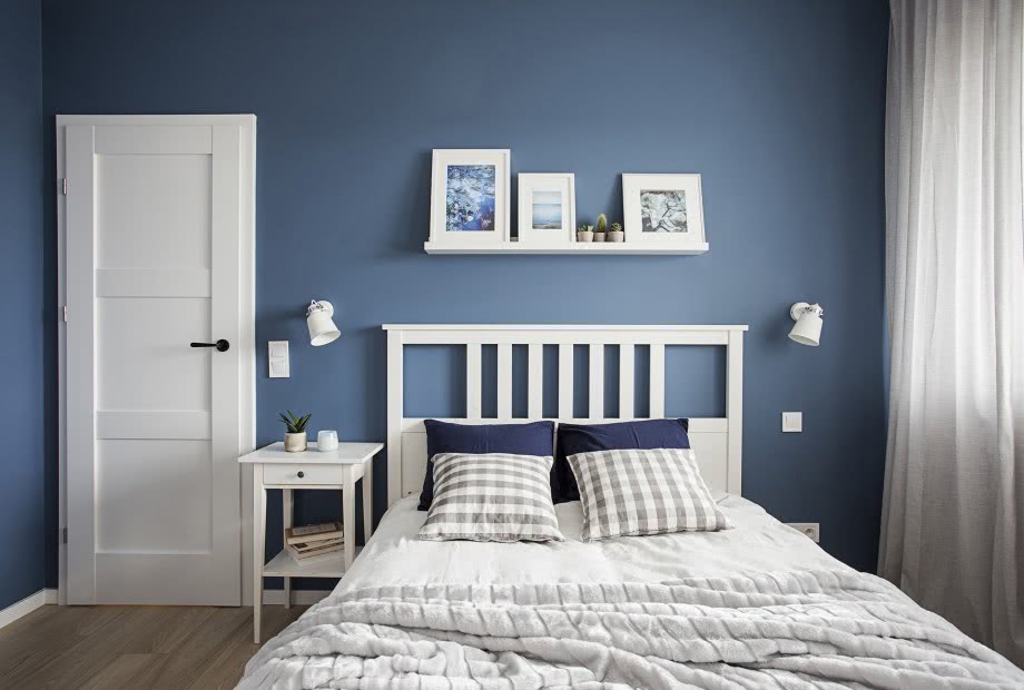 Если вы любите цвета, но при этом ожидаете, что спальня будет приглушенной и спокойной, сочетание белого и синего станет идеальным решением. Здесь есть чем похвастаться, потому что в спальне подойдут как темно-синий (тогда у вас может возникнуть соблазн оформить его в дико модном морском стиле), так и пастельный синий.