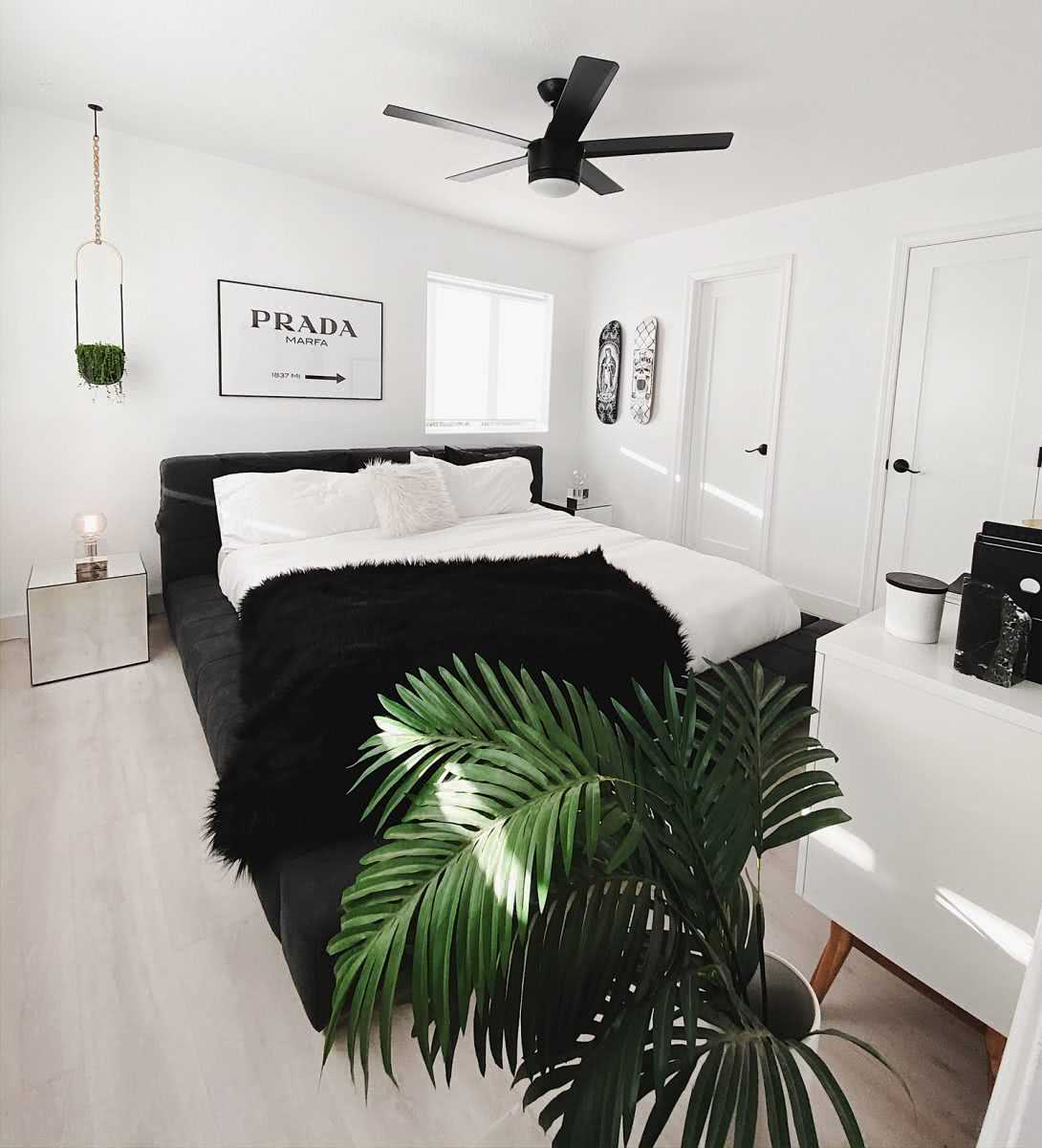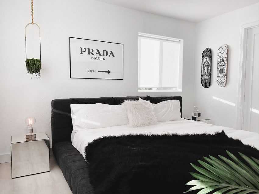 Используйте мебель с разной отделкой и интересные постельные покрытия с графическим рисунком. Хотя дизайн часто основан на минималистской стороне, не бойтесь использовать различные мелкие декоративные элементы, как например, сувениры, чтобы вдохнуть жизнь в спальню. Это также относится и к книгам, которые вы можете с гордостью демонстрировать на полках.