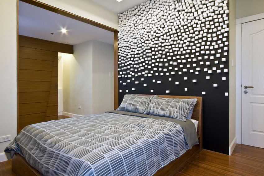 В качестве необычной стеновой отделки применяют белый кирпич или обои, имитирующие кирпичную кладку. В основном данный оформительский прием применяется только для одной акцентной стены, которая располагается за изголовьем кровати. Не менее оригинальным покрытием является фактурная штукатурка, объемные гипсовые или фактурные деревянные панели.