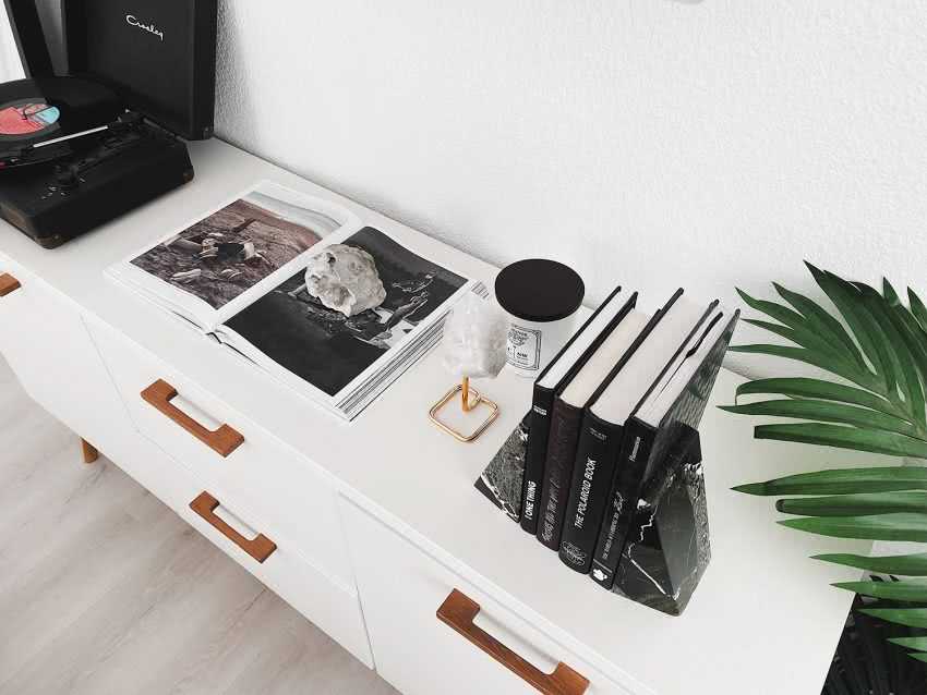 Очень оригинально будут смотреться белоснежные стены, украшенные насыщенными плакатами, картинами или фотографиями. Благодаря различным деревянным скульптурам, фарфоровым статуэткам, серебряным фигуркам, стеклянным или керамическим вазам и прочим аксессуарам, однотонная обстановка приобретет определенное настроение и станет более интересной.