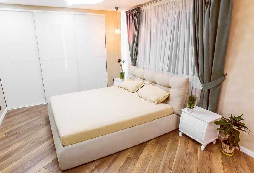 Сочетание бежевого оттенка с бежевым в просторной спальной комнатеИсточник stroy-podskazka.ru