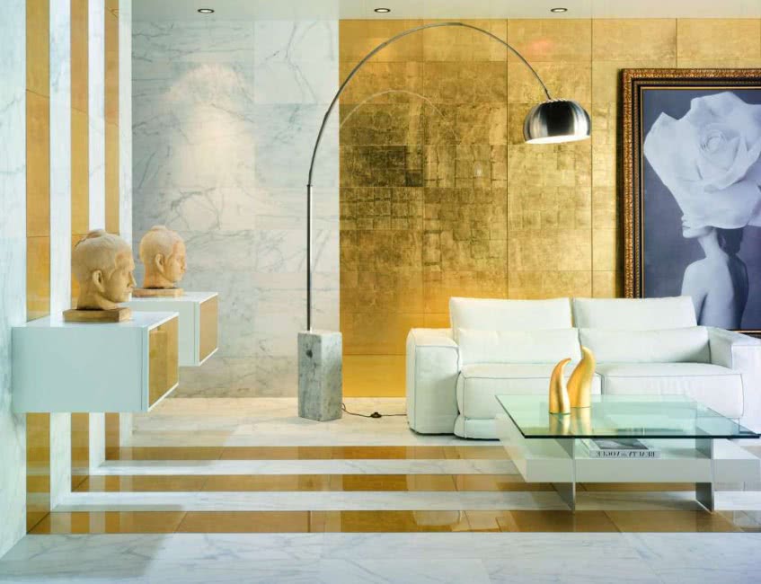 Но золото также бывает разным. Для объемных помещений с высокими потолками и большой квадратурой часто используется искусственно состаренный материал, не имеющий сильного характерного блеска. Такая комната будет напоминать убранство царских палат. Сияющее покрытие имеет более широкую область применения, она часто используется в минимализме, при отделке в стиле барокко или рококо, но здесь важна мера.