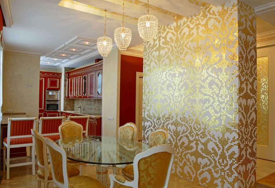 на кухне роль золотого фрагмента может выполнять небольшая люстра, мозаичный фартук, ручки шкафчиков. Такие элементы будут уместны в любом стиле.