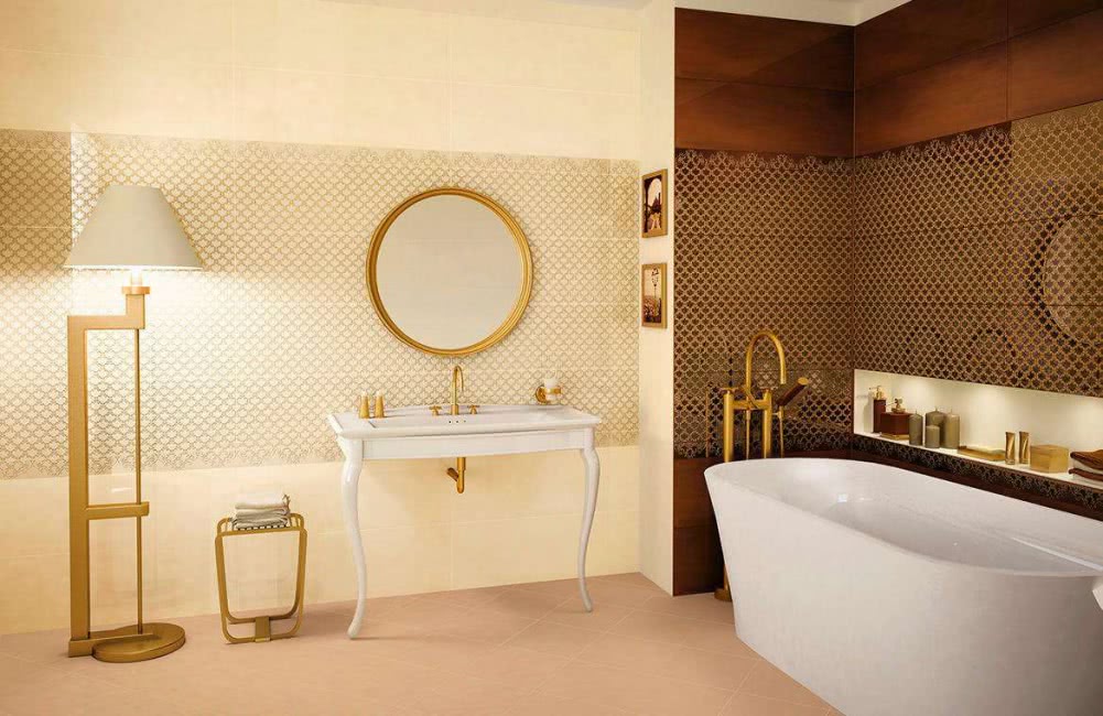 Золото отлично вписывается в интерьер ванных комнат, но использовать его необходимо аккуратно, так как цвет визуально сжимает пространство