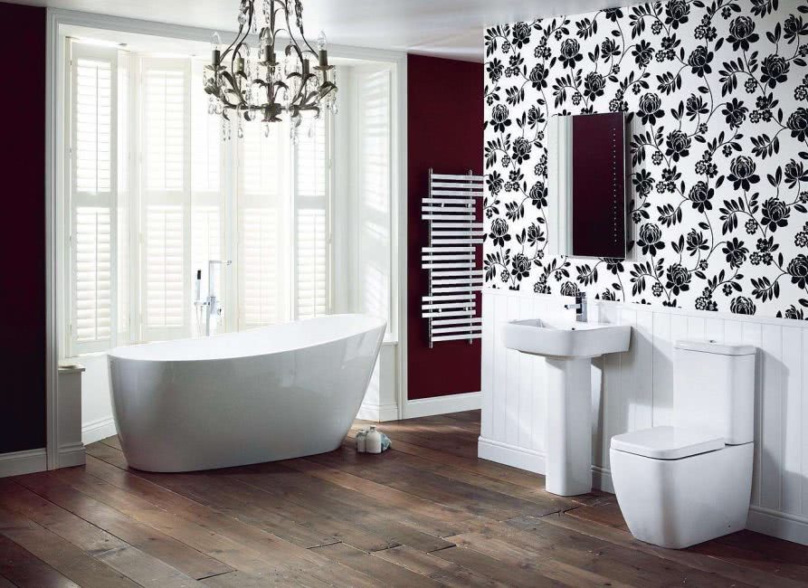 - Оригинальность отделки (обои в ванных комнатах используются редко, поэтому можно сделать привлекательный и нестандартный интерьер).