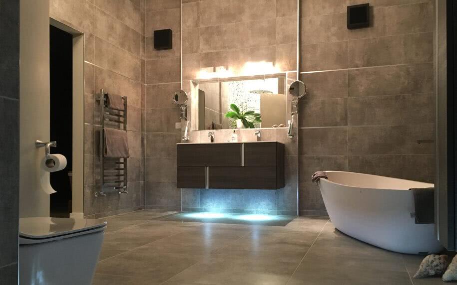 Красиво смотрятся вариации серой плитки(нет не скучно), особенно с текстурой(стильно выглядит при подсветке). Многие из видов серого кафеля на фото — вполне бюджетные варианты и хорошо смотрятся в реальных квартирах.