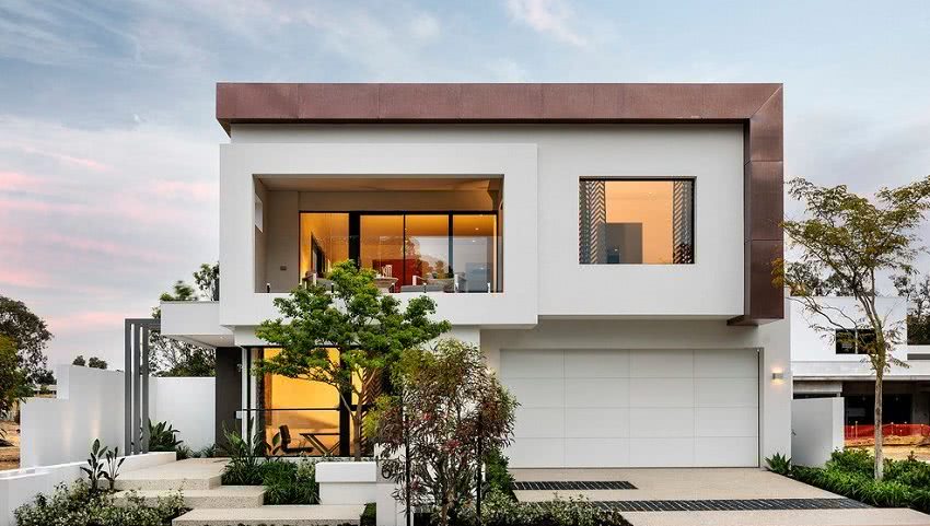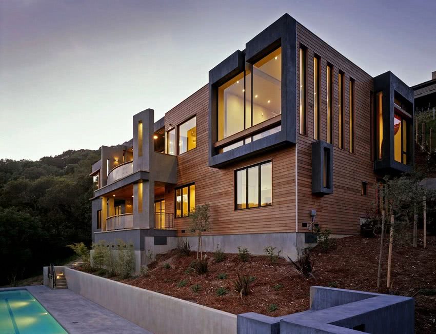 На участках со сложным рельефом обыгрывают ландшафтные недостатки (возвышенности, камни) со строгой геометрией коттеджа. Экстерьер с включениями из крашеного бетона (декоративной штукатурки) визуально выделяет дом на фоне ландшафта. Окна до пола гармонично вписываются в композицию строения, открывают красивый вид.