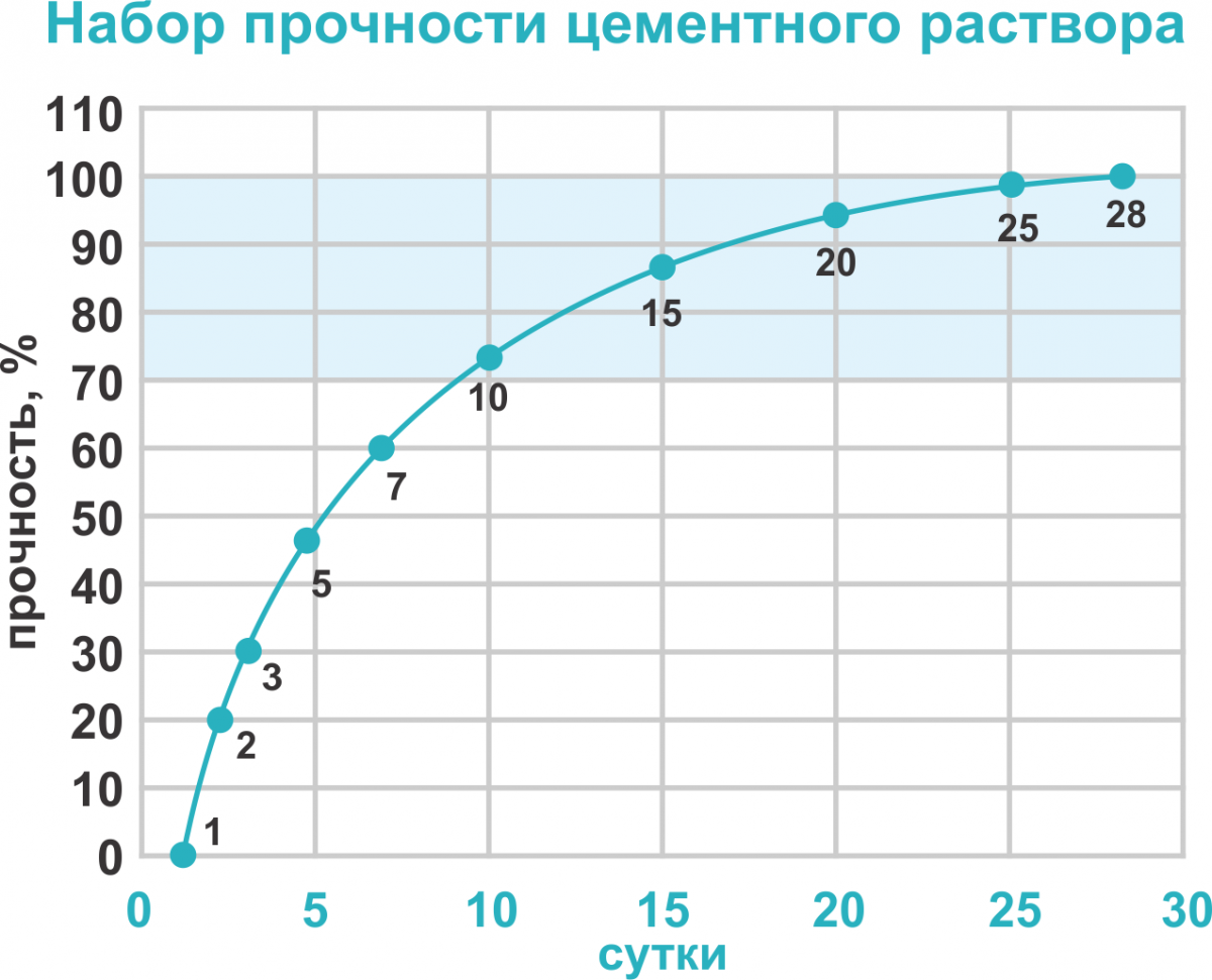 Отвердевание цементного раствора происходит в течение 28 суток, по истечении которых раствор набирает расчетную прочность. Набор прочности происходит не линейно: самый быстрый темп отвердевания наблюдается непосредственно после укладки раствора, затем он постепенно замедляется. Поэтому, чем больше времени прошло, тем меньше влияют на процесс отвердевания неблагоприятные внешние воздействия.
