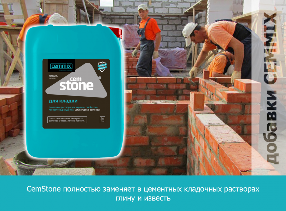 Очень удобны в работе специальные пластифицирующие добавки, например,CemStone, которая полностью заменяет в цементных кладочных растворах глину и известь. Добавка протестирована в лаборатории и снабжена четкими инструкциями по дозированию и применению. Она обеспечивает кладочным растворам все необходимые свойства: