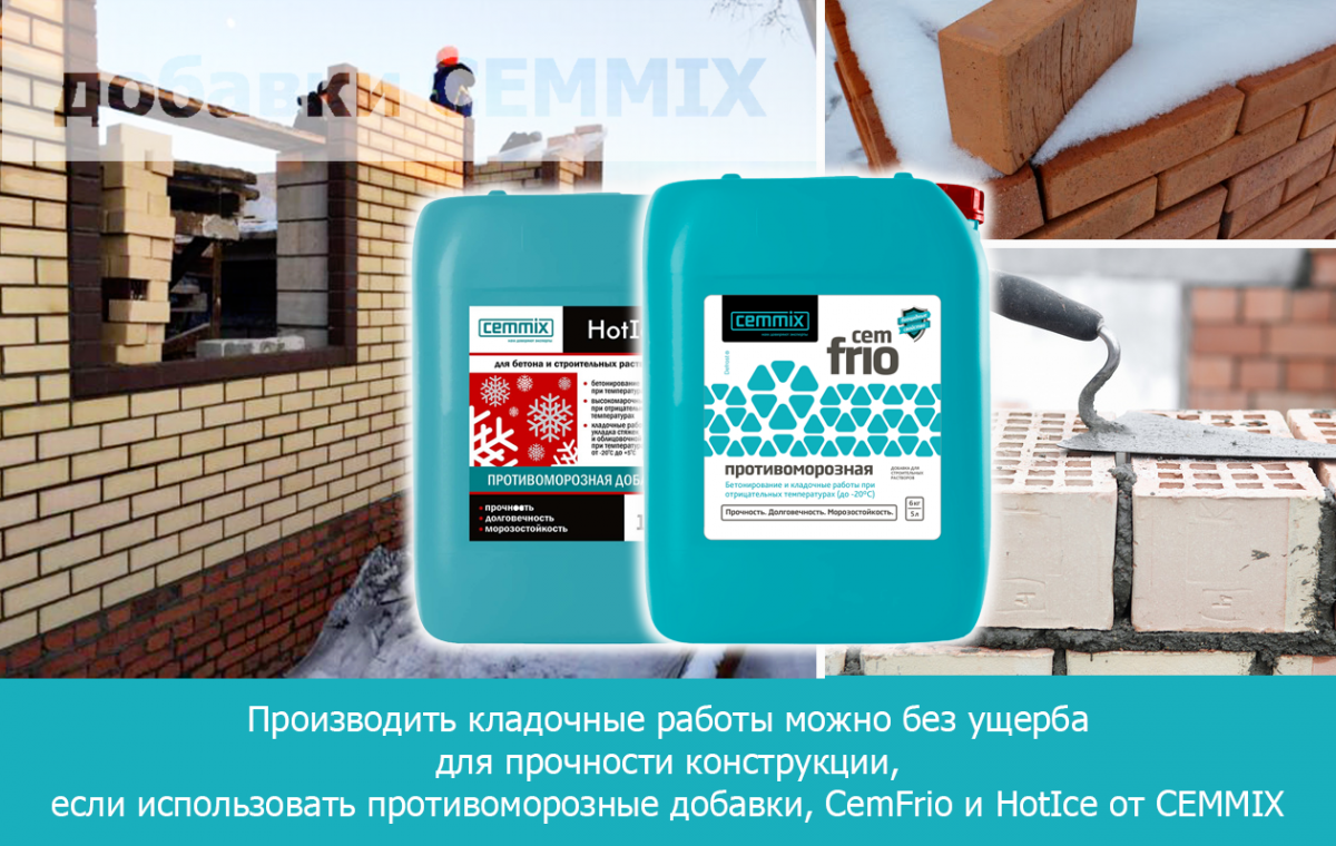 В этих условиях производить кладочные работы можно без ущерба для прочности конструкции, если использовать противоморозные добавки, например,CemFrioиHotIceот CEMMIX, которые не только позволяют работать при отрицательных температурах (до –20°С), но и имеют свойства пластификатора, а также обеспечивают следующие преимущества:
