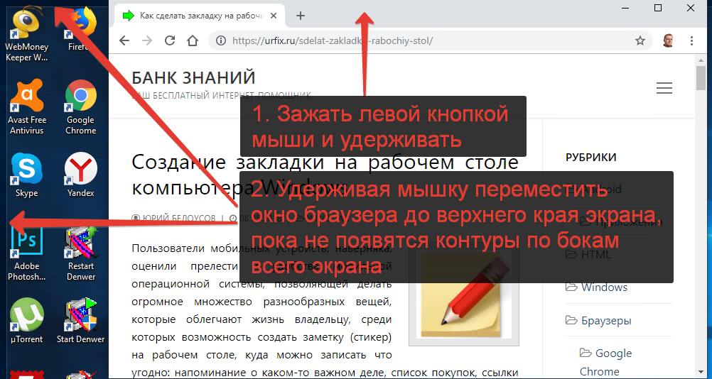 - Удерживая мышь зажатой нужно перенести окно браузера в самый верх экрана;