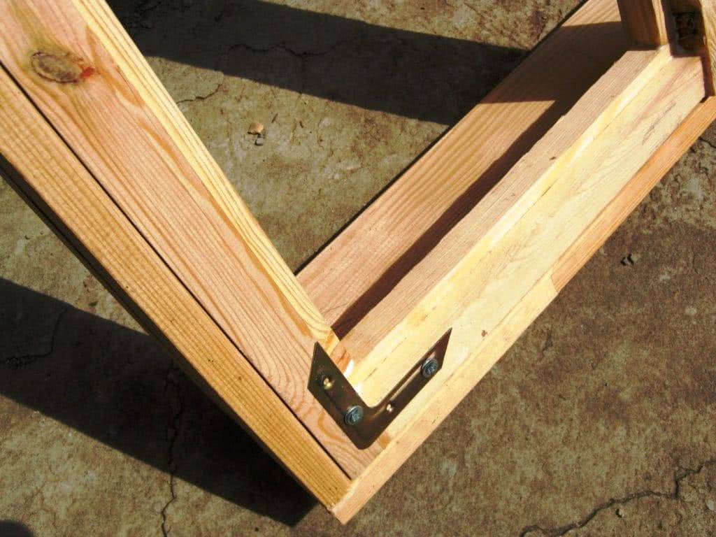 Каждая половина окна изготавливается отдельно друг от друга, а одна из них должна иметь более тонкую раму. Она соединяется с основной, посредством навесных петель, таким образом, создается открывающаяся створка. С помощью саморезов к раме крепится вспомогательная ручка, а в вертикальном брусе делается паз для закрывания створки.
