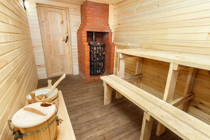 В расчет площади основной комнаты в бане берется не только предполагаемое количество человек, которое будет находиться внутри, но и размер печи. Рядом с ней должно оставаться достаточно пространства, чтобы никто не получил ожог или другое повреждение.