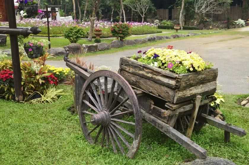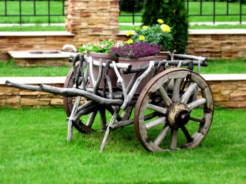 Большое количество разнообразных клумб с самыми разными цветами завершат этот дизайн, причем они не всегда симметричны или правильны по форме. А основанием для них могут служить старые горшки, кастрюли, велосипеды и все остальное, что долго искало своего применения.