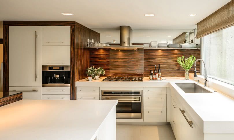 Распространённый приём для интерьера современной кухни — «техническая стенка», где сконцентрирована большая часть бытовой техники, исключая варочную поверхность.