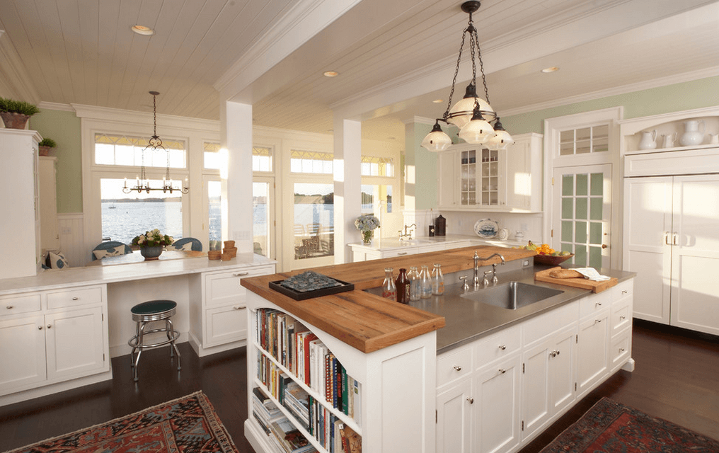 Белый кухонный остров — он прекрасно впишется в классический интерьер, а также будет гармонично выглядеть на кухнях, обустроенных в стиле прованс, кантри, шебби-шик, средиземноморский. Для обустройства подобной конструкции желательно использовать такие материалы, как дерево, облицовочный кирпич, керамическая плитка.