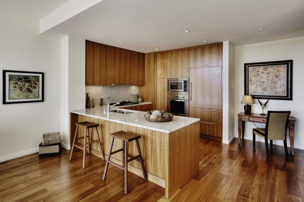 Такая конструкция занимает гораздо меньше места, чем островная планировка кухни. Поэтому гарнитур с полуостровом можно устанавливать даже в не слишком больших кухнях, квартирах студиях или тех квартирах, где кухня объединена с гостиной.