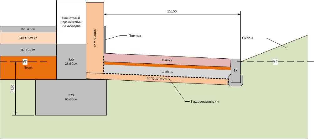 Еще один момент. Многие размышляют над тем, утеплять цоколь или нет. Если хотите экономить на отоплении, ответ — утеплять обязательно, как и отмостку. Узел утепления и облицовки цоколя — один из вариантов — приведен на фото ниже.