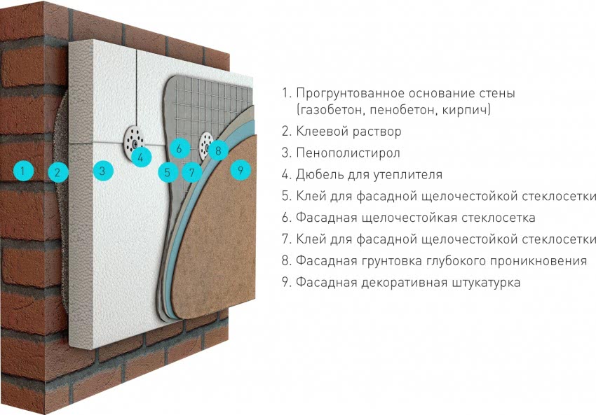 Схема утепления цоколя здания с использованием фасадной штукатурки