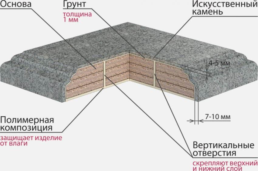 Камень, содержащий полиэфирную смолу, схож по своему составу на акриловые аналоги. Имеет хорошие механические свойства и по этому показателю превосходит даже облицовочные элементы из натуральных, природных материалов.