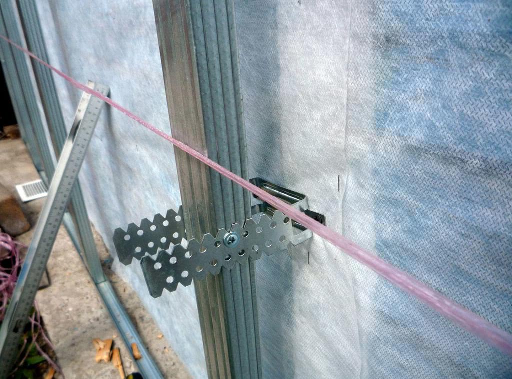 Все начинается идентично: подготавливаются материалы, прорисовывается схематично будущая конструкция, осуществляется монтаж. Профили устанавливают в соответствии с нарисованной схемой под прямым углом к основанию дома с шагом 50 см. Несущие профили необходимо закреплять дюбелями.