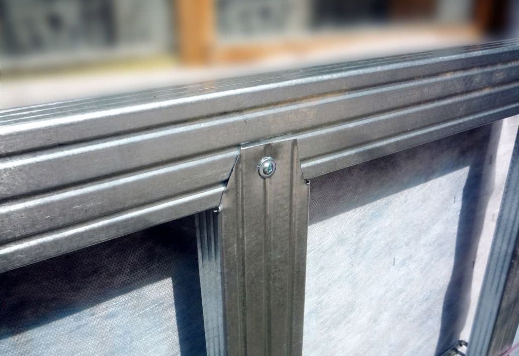 После установки вертикальных профилей необходимо установить поперечные переборки. Здесь потребуется на каждой стороне панели сделать лапки для крепления к профилю. Существуют сразу готовые каркасы, но у таких конструкций существует явный недостаток – их необходимо крепить непосредственно к стенам дома. Если стена сделана из пенобетона, то такой каркас может рухнуть. Также каркас не рекомендуют устанавливать на силикатном кирпиче. Стены из красного кирпича также не походят для готового каркаса. Кроме того, такие конструкции стоят дороже, чем установленный собственными руками.