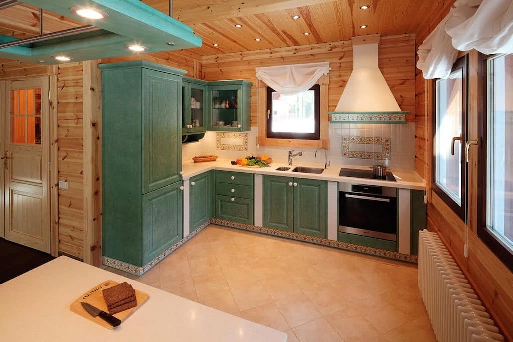 - Цвет. Для внутреннего оформления деревянных домов чаще всего используется сосна. Сам по себе материал достаточно светлый, но со временем он темнеет — это надо учитывать при выборе кухонного гарнитура и прочей мебели. Помимо этого, для дерева всегда требуется больше освещения, чем для «стандартных» кухонь.