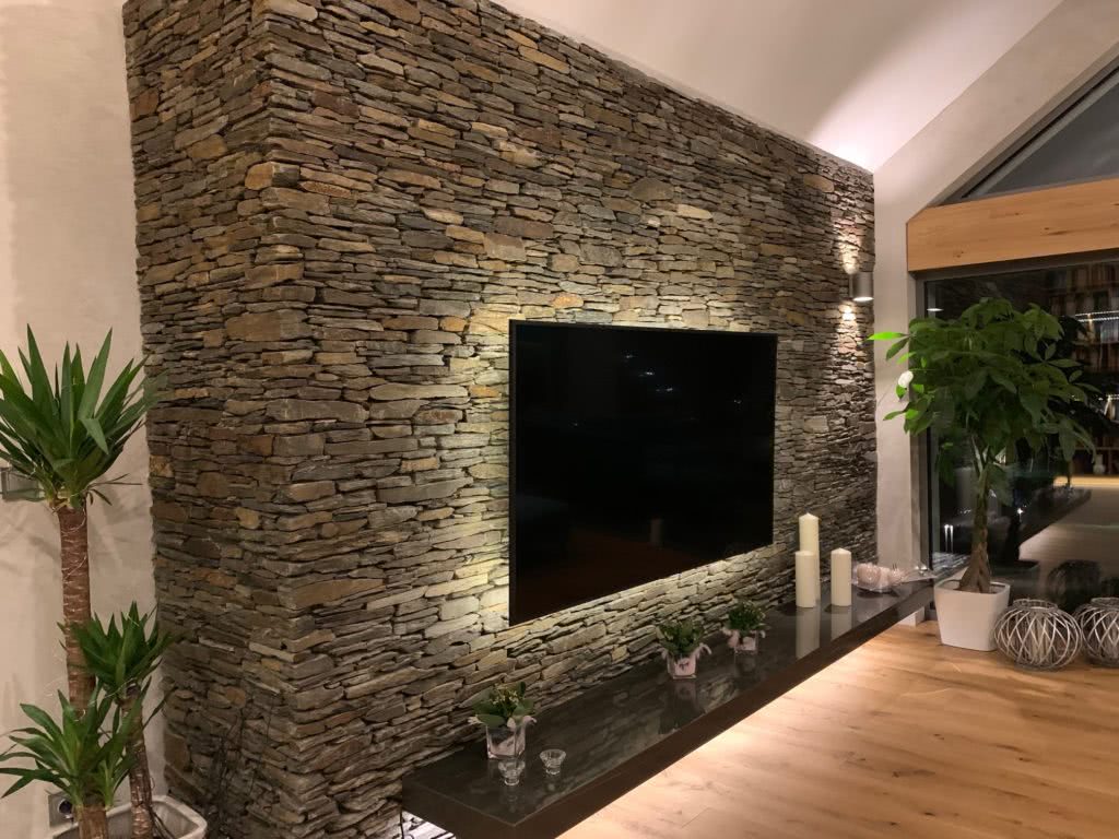 Стена из природного камня, например плоского песчаника, отличается от облицовки из искусственного материала, прежде всего, своей индивидуальностью. Чтобы сделать облицовку из искусственного камня максимально похожей на природный материал, для изготовления плиток песчаника используют до десятка литейных форм с разным рисунком поверхности.