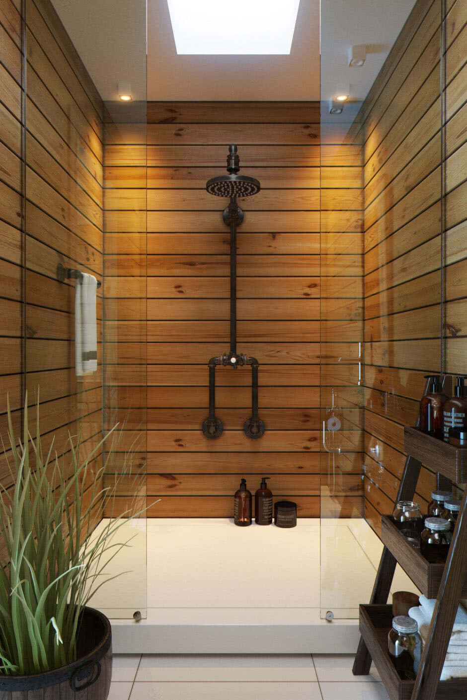 Самое логичное покрытие в обустройстве деревянных ванных комнат – вагонка, как видно из фото подобных проектов в сети. Она, в отличие от деревянного пола, прослужит дольше, ведь пар, остывая, будет оседать вниз, а не на стены. А если обить стены вагонкой из лиственницы или тиса, которые обладают повышенной устойчивостью к влаге, то сохранность отделки возрастет в разы.