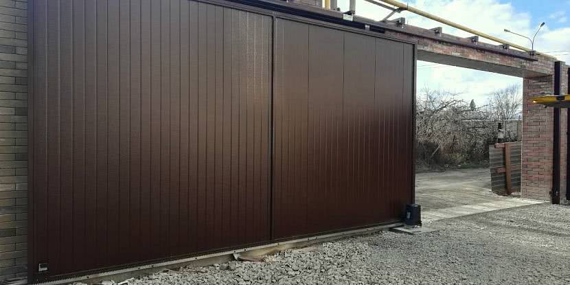 Эти откатные конструкции часто устанавливают на промышленных объектах. Створки таких ворот массивны, однако достаточно надежны в эксплуатации. В подобных конструкциях полотно двигается по балке, которая помещена над проездом.