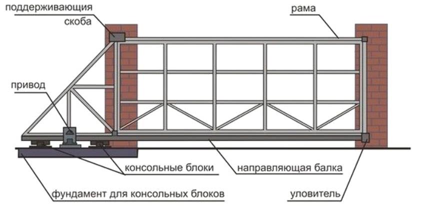 Рис. 5. Схема консольных откатных ворот с расположенным вверху консольным узлом