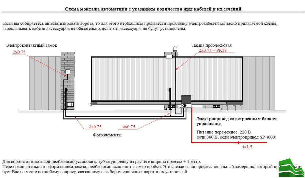 Продумать прокладку электропроводки нужно еще на том этапе, когда вы подготавливаете яму под фундамент, поскольку именно там её и потребуется проложить. Ворота раздвижные с электроприводом требуют правильного подключения. Чтобы произвести монтаж правильно, вам потребуется присоединить привод к роликовому механизму, чтобы элементы отъезжали сами, а также присоединить фотоэлемент к приводу. Таким образом, владелец получает возможность управлять конструкцией дистанционно. Кроме того, раздвижные ворота обычно оснащаются еще и сигнальными лампами или же устройствами для подачи звуковых сигналов. Это делается в соответствии с требованиям к безопасности пользования.