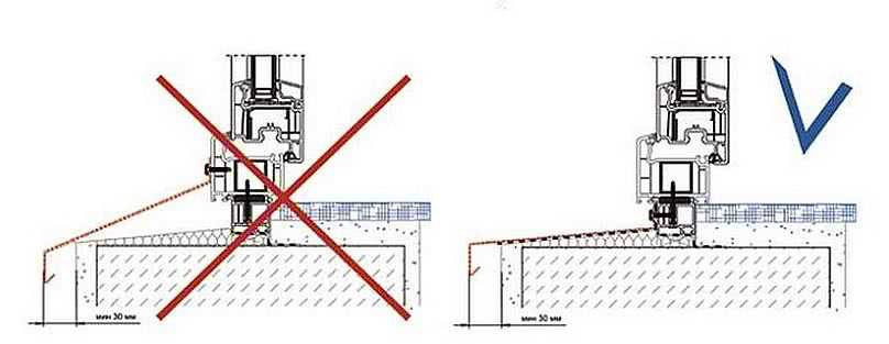 Согласно ГОСТ при монтаже отливов нижняя кромка коробки окна должна быть не ниже наружного края проема. Такая особенность объясняется необходимостью предотвращения перекрытий специальных водоотводных отверстий, которые размещаются на наружной стороне оконной коробки. Свес конструкции должен быть равен 3-4 см.