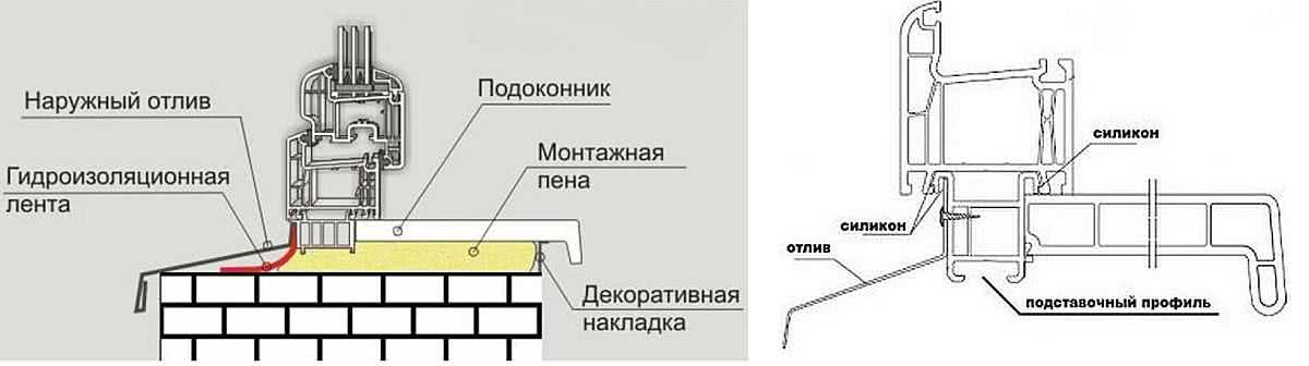 - если устанавливается изделие из ПВХ, перед тем как врезать его в стену, нужно предварительно обработать паз герметиком. Также между отливом и основанием можно проложить слой пленки, край которой будет свисать на стену.