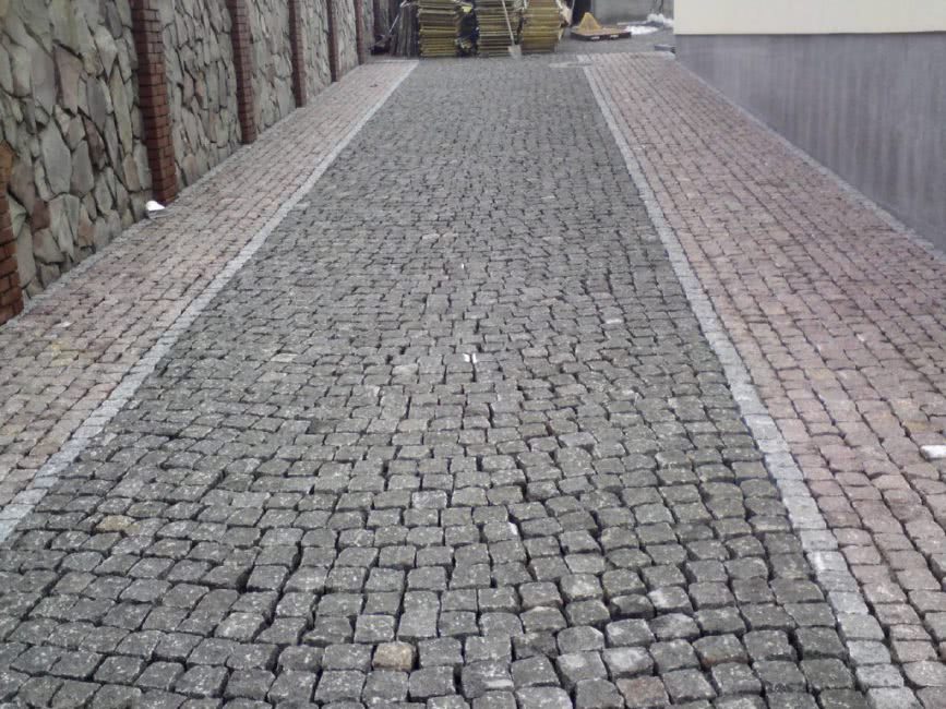 - Подрезанные плитки и окантовочная брусчатка (ее используют при отсутствии бордюра) укладываются последними