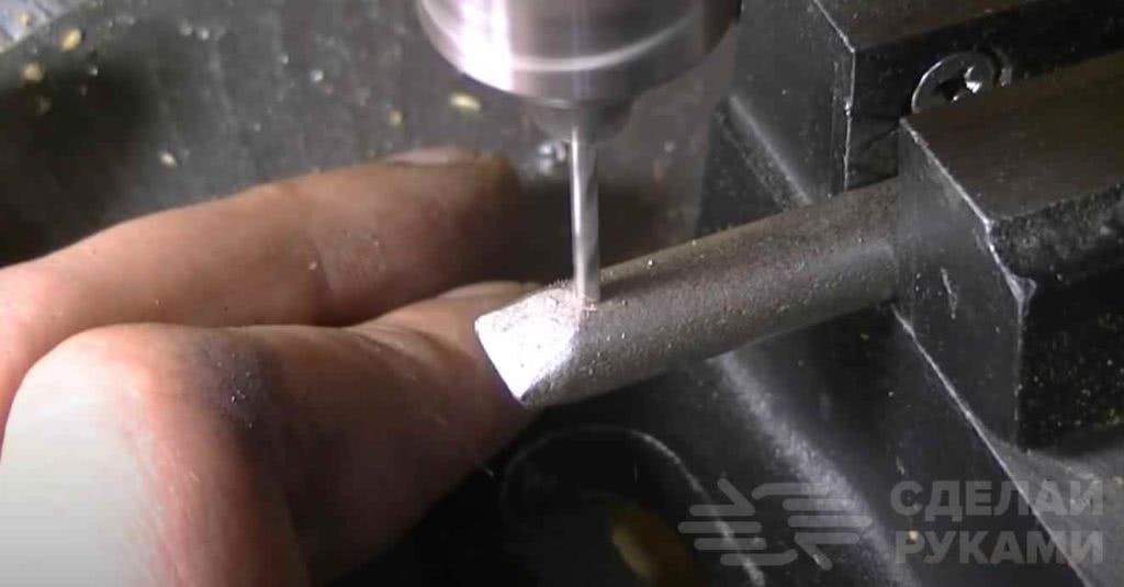 От начала жала паяльника отступаем около 8 мм, и затем сверлим отверстие диаметром сверлом по металлу 2 мм.
