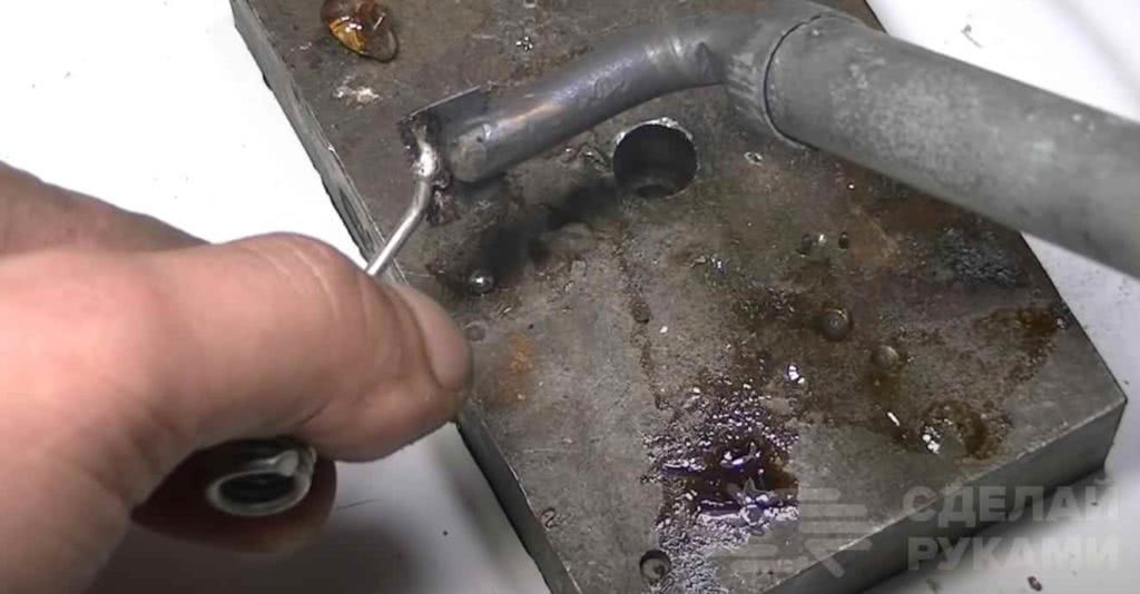 Край ножовочного полотна нужно облудить — для этого автор использует специальный флюс для пайки стали.