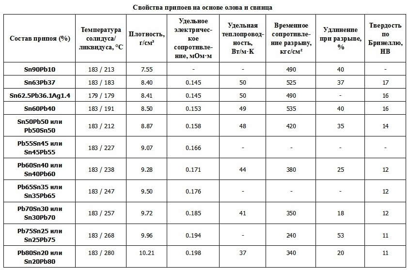 - Для припоя обычно используют оловянно-свинцовый сплав, который имеет различное содержание олова. Чем больше олова, тем меньше температура плавления. Распространённым припоем является ПОС-40, где содержится 40% олова. Он плавится, когда достигает температуры в 230 градусов. А ПОС-60 — при 180 градусах. Меньшую температуру плавления имеет свинцово-оловянный сплав, в который добавляют висмут. Это марка припоя называется ПОСВЗЗ. Температура плавления — 130 градусов. Если необходимо сплавить алюминий, тогда применяют специальный сплав, где температура плавления равна 400 градусам.