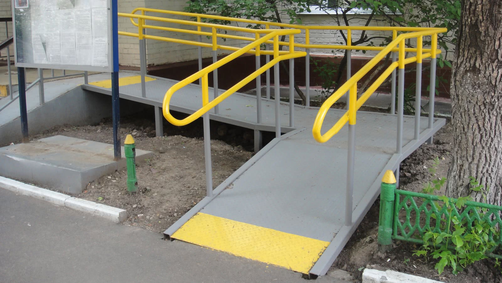 - постоянные пандусы на входных группах объекта (на крыльце, на лестничных маршах), на внутренних переходах между этажами или разноуровневыми частями здания;