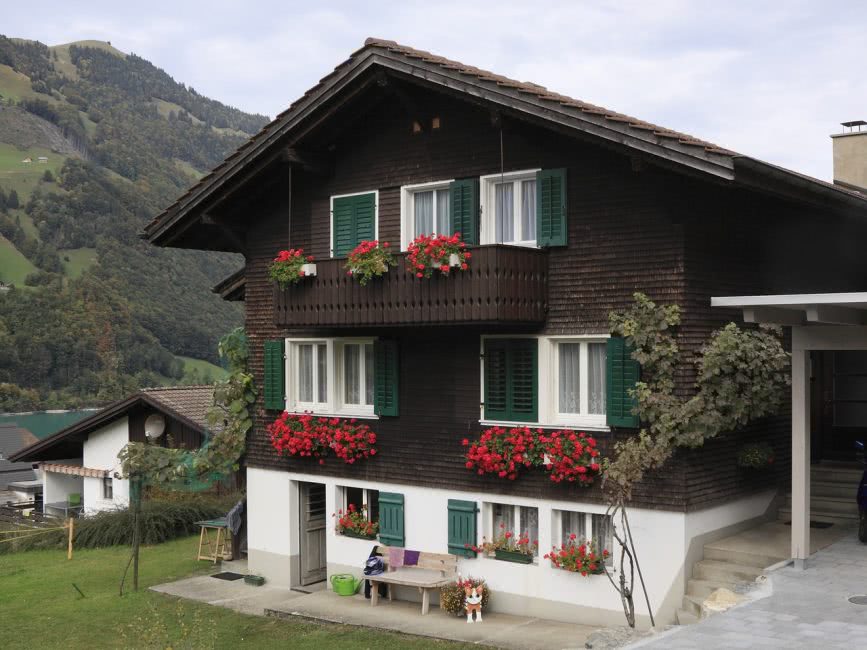 - Небольшой загородный дом можно оформить в швейцарском стиле: сделать кровлю из натурального дерева и разместить светлые панели на фасаде.