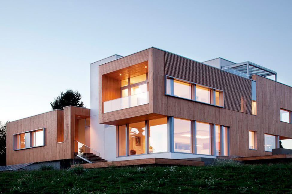- Стильные стеклянные панели позволяют создавать дома в футуристическом стиле с обилием света в комнатах. Они отлично сочетаются с белыми либо стальными панелями из других материалов.