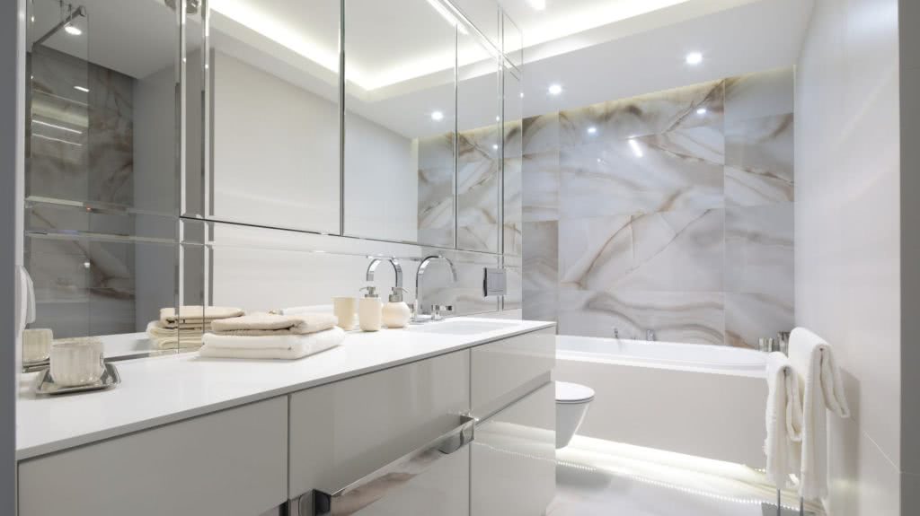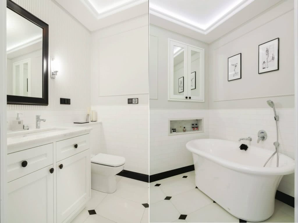 Однако, если вы хотите добавить немного элегантности в ванную комнату, отделанную с высоким блеском, светоотражающая керамическая плитка на потолке может быть отличным вариантом. Это решение не только выглядит очень хорошо — особенно в случае высоких, классических ванных комнат с гладкими стенами — но также практично — плитка водонепроницаема и ее легко содержать в чистоте.