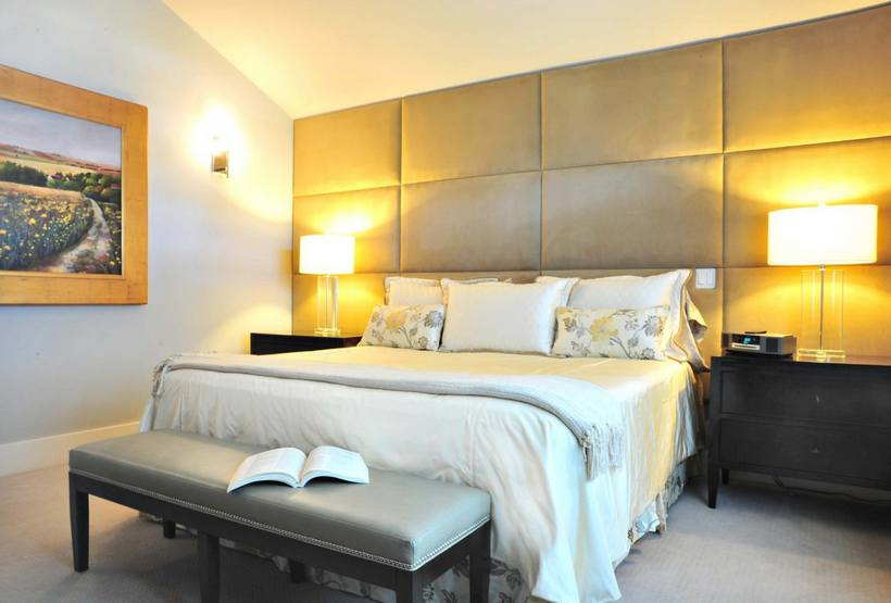 Мягкие панели часто заменяют изголовье кровати в небольших спальнях. Они не только красиво выглядят, но и очень приятны на ощупь.